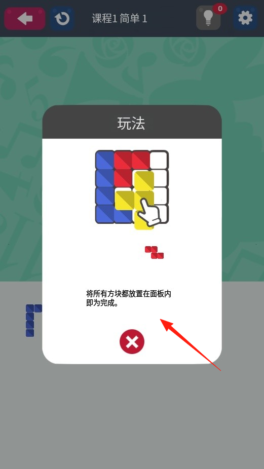 1、查看玩法说明,了解需将方块放入面板,根据指引拖动方块,尝试填满面板空间,完成拼图挑战,体验基础拼图机制。