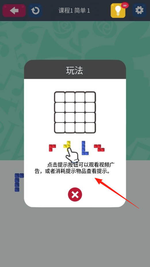 2、若遇困难,点击提示按钮,选择观看广告或消耗道具获取拼图摆放提示,利用提示调整方块位置,推进拼图进程,体验提示辅助玩法。