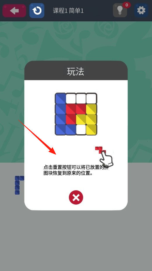 3、操作失误时,点击重置按钮已放置的拼图块会回到原位,可重新规划摆放调整策略,继续完成拼图,体验重置纠错机制。