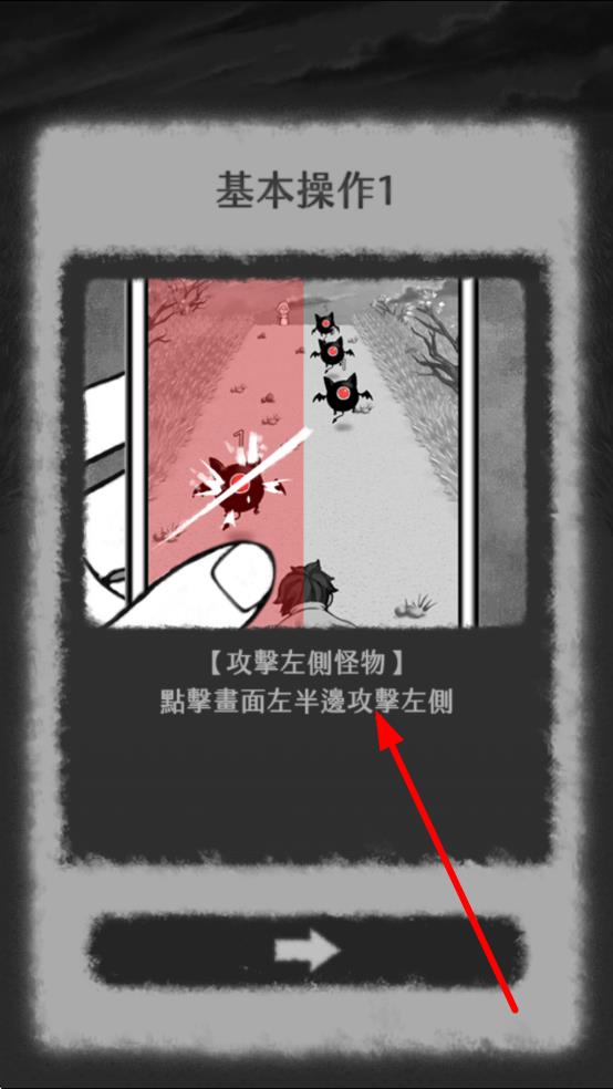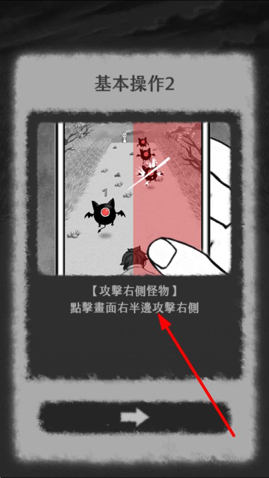 2、到基本操作2步骤,按照攻擊右側怪物指引,点击画面右半边位置,实现对右侧怪物的攻击,掌握另一基础操作。
