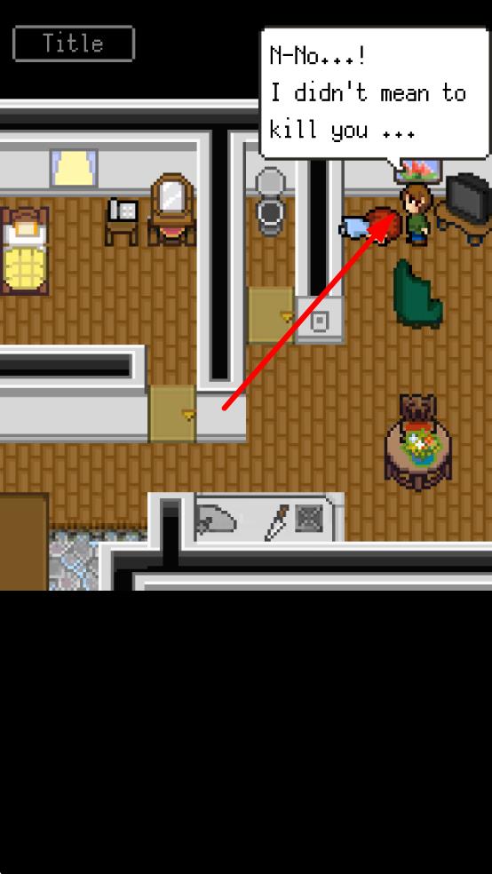 2、关注箭头指向的倒地角色及对话 I didn't mean to kill you...,探索房间收集线索、道具,推动因意外事件引发的故事发展。