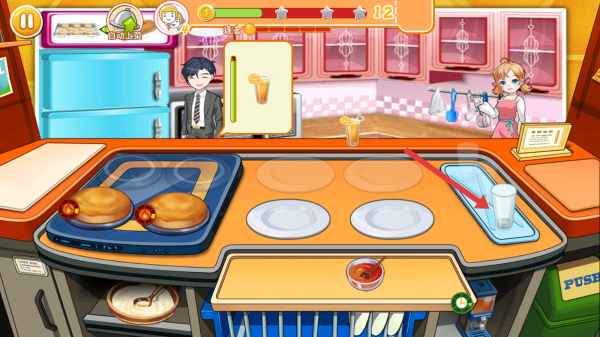 2、顾客的订单上方图示需橙汁,松饼时,优先做耗时短的如橙汁:点击杯子+橙子组合,松饼注意翻面和装盘。