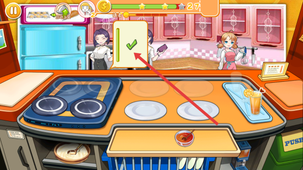 1、开始经营烤松饼,按提示点击面糊开始制作松饼,将面糊放灶台,等进度条完成或者出现火焰标记时操作。
