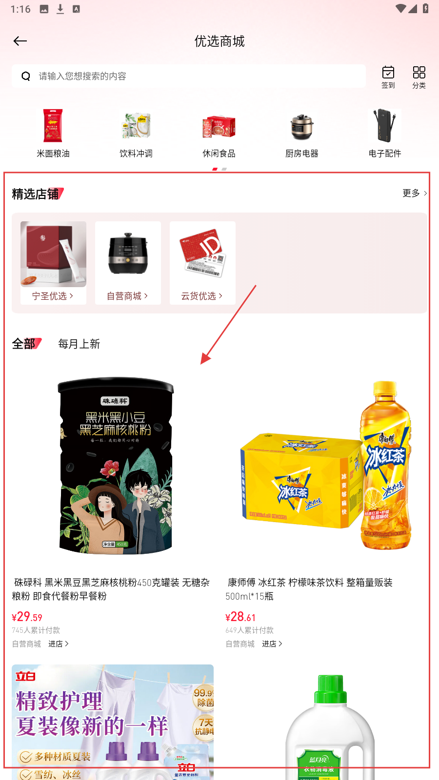 2、在【优选商城】,按需点分类找商品,也可逛精选店铺,快速定位心仪好物。