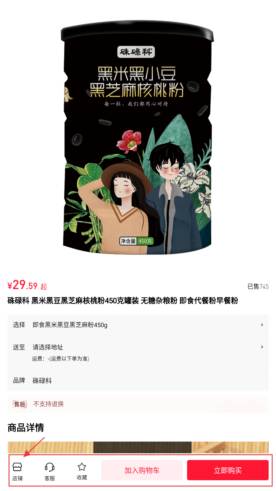 3、查看商品详情时,确认规格、售后,可点【店铺】看商家信息,通过【加入购物车】或【立即购买】完成选购。