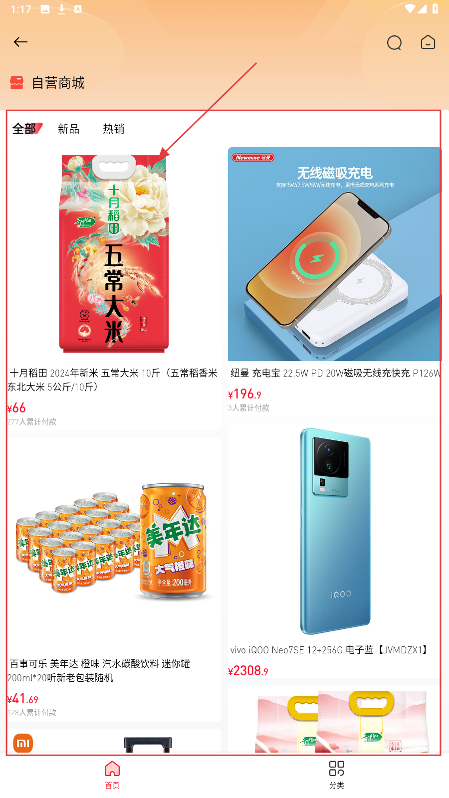 4、逛【自营商城】,切换全部、新品、热销分类,高效筛选心仪商品。