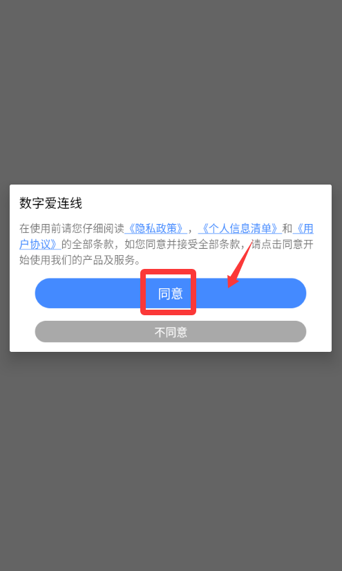 1、点击数字爱连线红色框框的同意进入游戏。