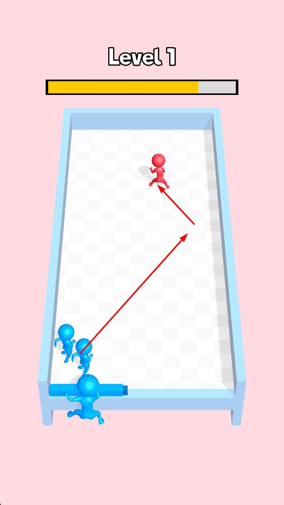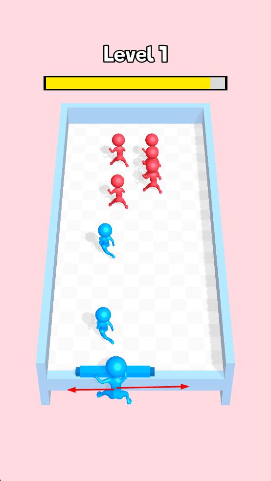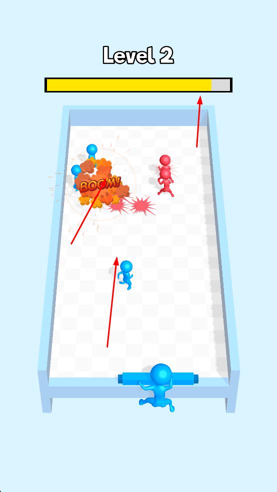 2、蓝色小人可以通过碰撞等方式攻击红色小人,成功击败红色小人会获得分数,屏幕上方的进度条会显示关卡进度。