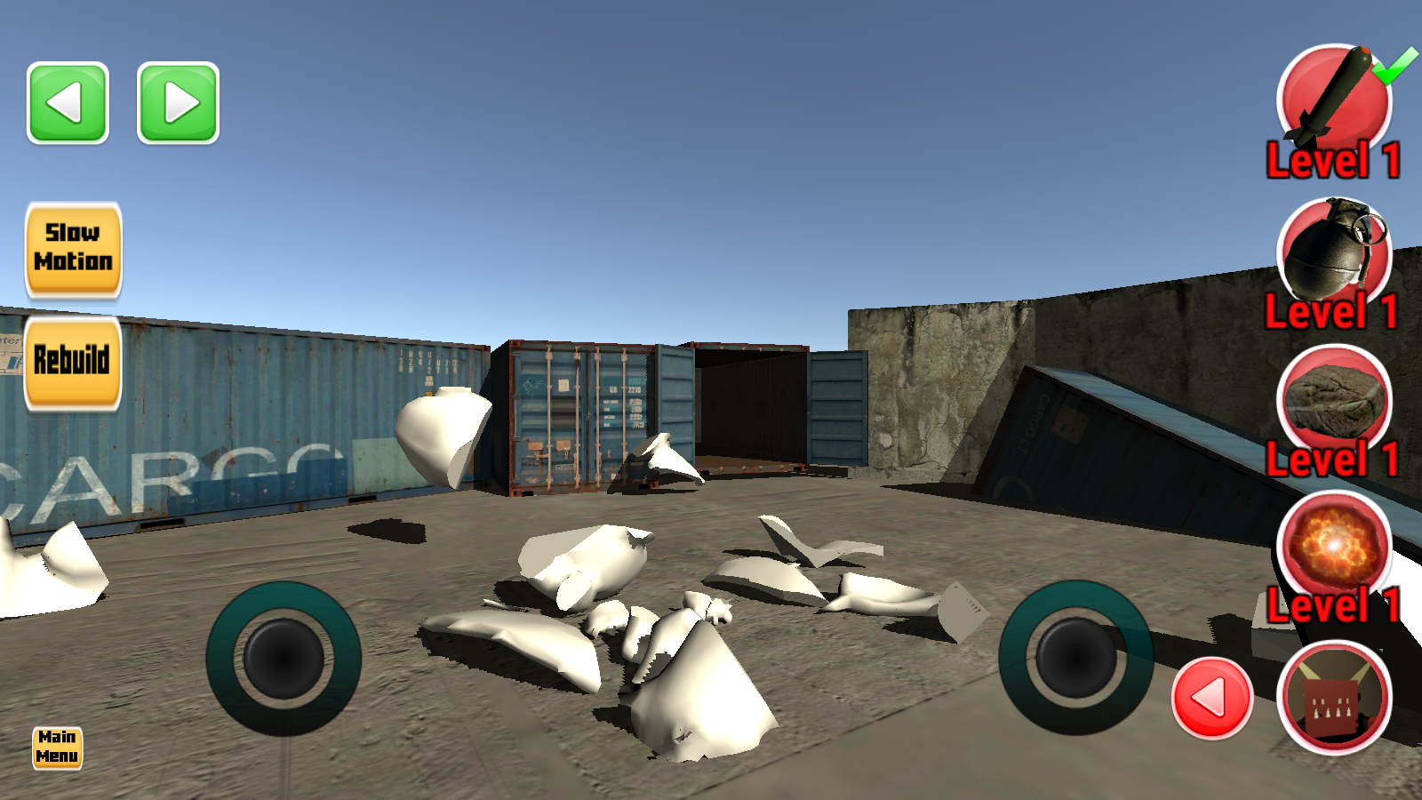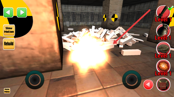 2、多样武器轮番使用:提供各种武器供玩家轮番上场,从石头、手榴弹到导弹均可用来摧毁雕塑,搭配慢动作按钮,最大化破坏的娱乐效果。