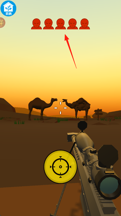 1、第一关,根据上方给的任务红色敌人5个需要射击淘汰,注意场景骆驼为干扰,专注目标。