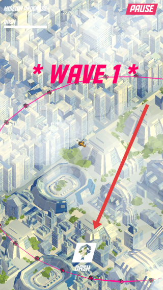 1、进入WAVE1的游戏关卡,需要点击DASH的图标,启动飞机冲刺的机制,开启首波的战斗。