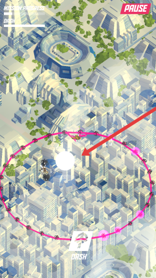 2、在操控战机在城市中飞行,需要利用粉色路径躲避敌人的围攻,看准时机使用攻击进行反击。