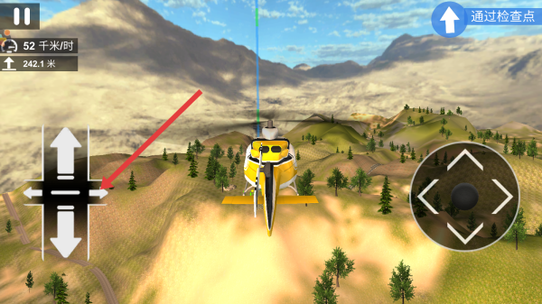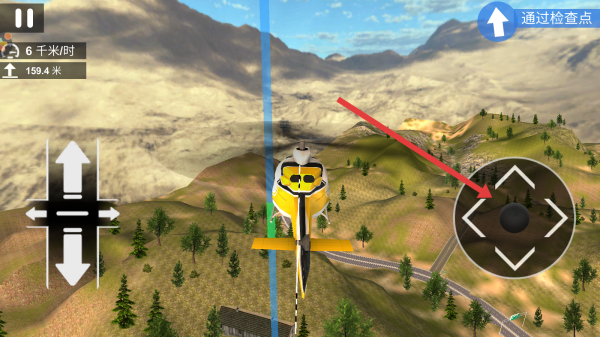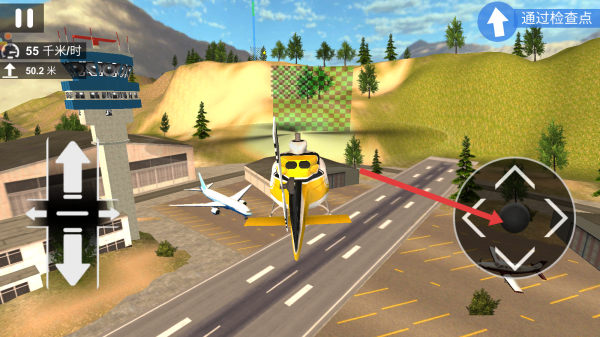 1、完成开飞机的教程后,进入场景用左侧十字键控制直升机升降、转向,右侧圆盘调整机身角度,保持飞行平稳。