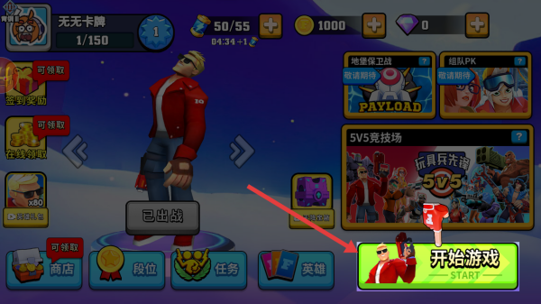 1、从英雄展示界面出发,点击下方开始游戏,选定5V5等对战模式,确认无无卡牌出战,进入战斗场景。