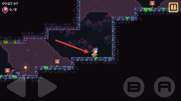 2、用虚拟按键操控角色移动跳跃,避开沟壑障碍,收集场景宝石关注0/5进度推进关卡。