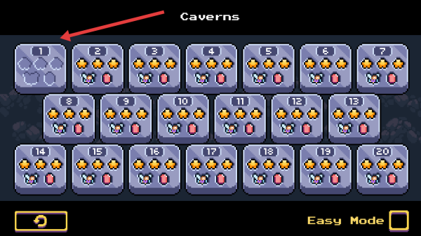 1、主界面点击TAP TO START,进入关卡列表选Caverns章节1号关卡,开启像素洞穴场景冒险流程。