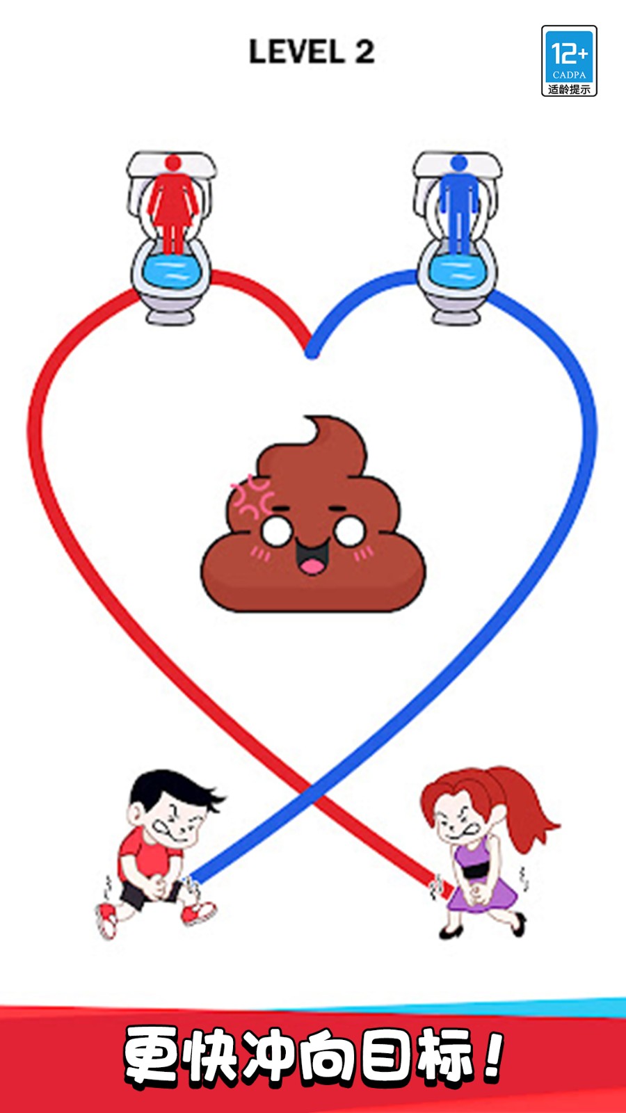 1、核心目标明确,玩家需在有限时间内绘制一条从起点至厕所的可行路线,角色将自动沿路径移动,路径错误或超时则闯关失败。