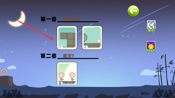 1、主界面点开始游戏,进入关卡选择页,选第一套魔核幼崽的1号关卡,开启像素场景冒险,操控角色行动。