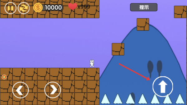 2、用左右按钮移动角色,遇障碍时点右下角上箭头跳跃,避开尖刺等危险,顺路收集金币,推进关卡流程。