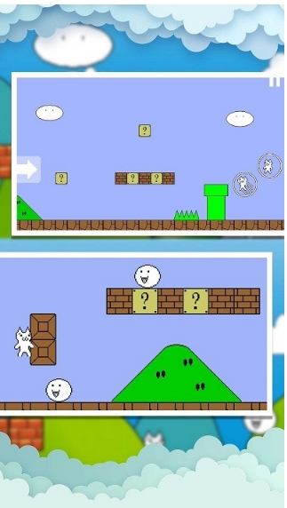 1、灵活操控闯关:通过点击、滑动屏幕操控猫里奥,单击跳跃、双击展开特殊道具,遇到突发陷阱时快速拖动调整方向,在混乱中寻找生存路径,突破重重障碍。