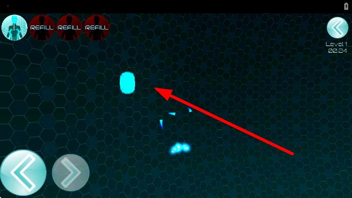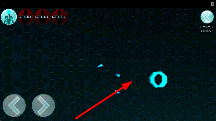 2、界面上方有REFILL提示,操控角色移动,瞄准箭头指向的蓝色环形目标,发射或移动靠近,完成关卡初期任务,推进游戏进程。