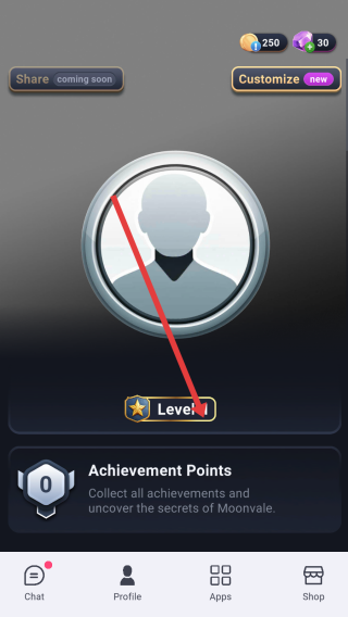 2、点击继续聊天的页面,用金币或者紫晶装饰角色,查看选项,留意着Achievement Points。