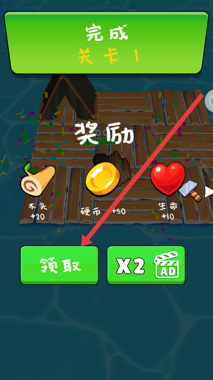 2、在完成第一个关卡后,点击领取按钮,获取木头、硬币、生命等奖励,用于加强生存的能力。