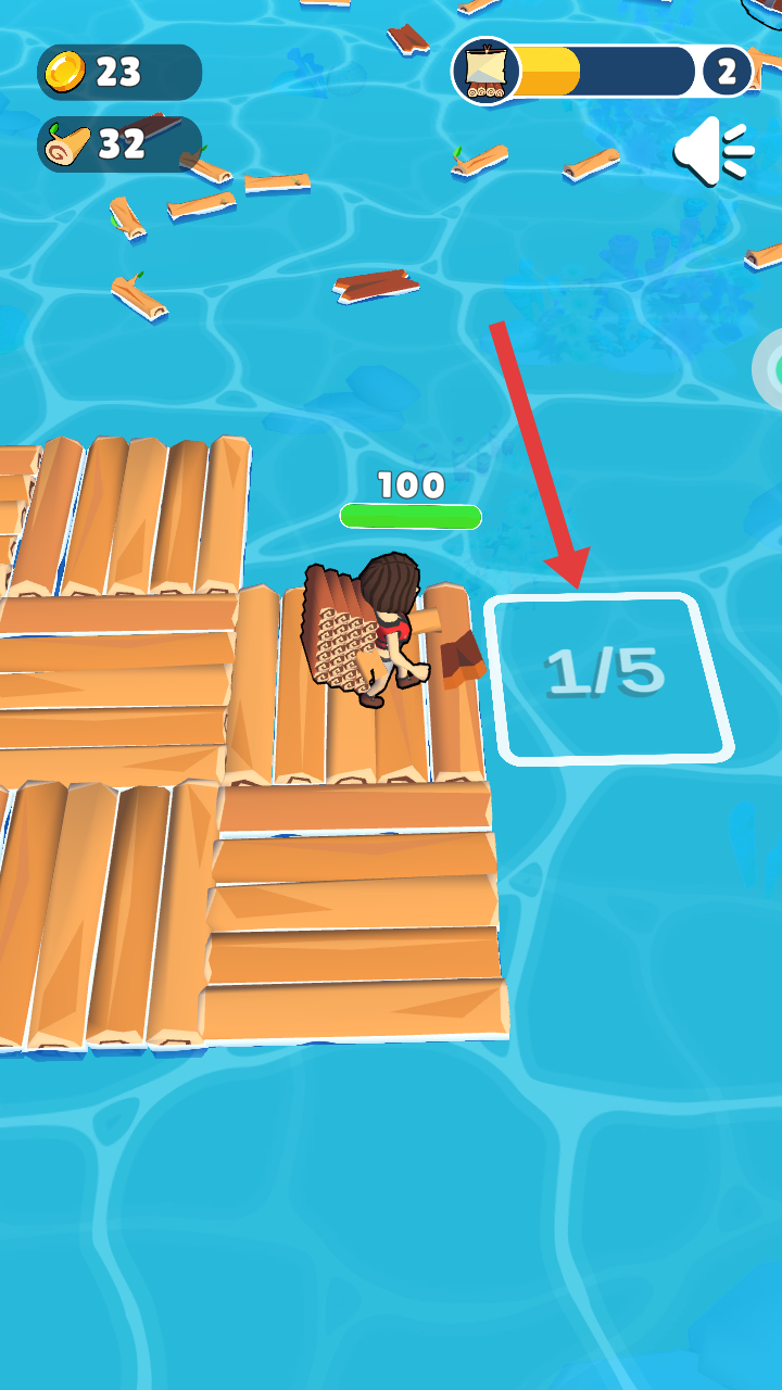 3、将收集的木头拖至木筏旁空白格子如1/5标识处,来进行搭建扩展木筏,扩大海上的生存空间。