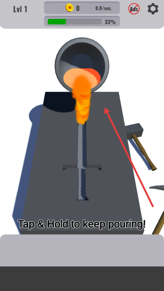 3、浇筑环节,按Tap&Hold持续长按,让金属流入模具,维持操作直至流程结束。