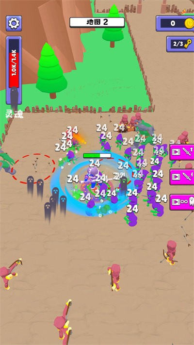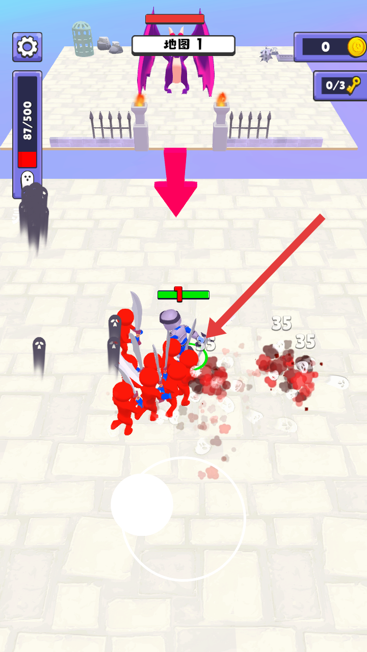 2、操控角色冲入敌群进行战斗,消灭红色敌人的同时还需要注意自身血量,借助伤害数值把控全场。