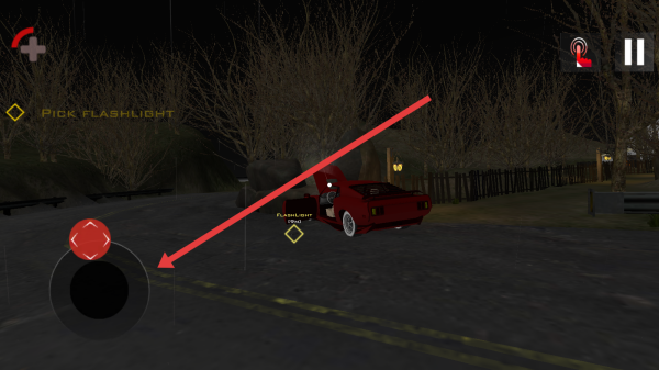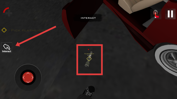 3、靠近汽车旁手电筒,根据箭头指向点击左侧Interact交互按钮,拾取手电筒道具,助力后续冒险。