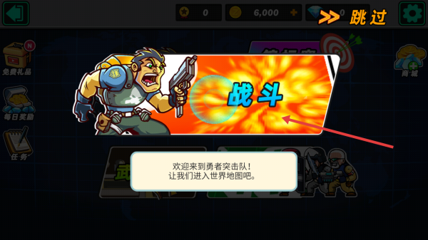 1、主界面点击战斗按钮,进入关卡选择页,开启勇者突击队冒险,准备投身第一场战斗流程。