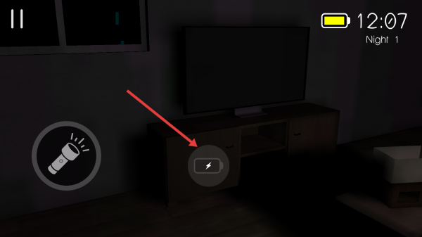 2、在Night1房间场景中,找到电视柜上带闪电标识的电池图标,点击互动,获取维持手电筒等道具运作的关键资源。