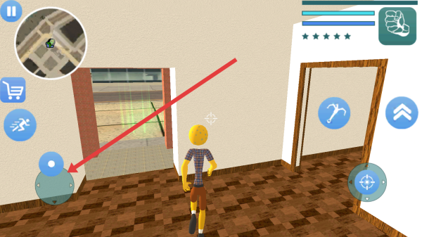 2、在室内场景通过滑动左下角虚拟摇杆操控角色移动,朝门口方向前进,探索外部区域。