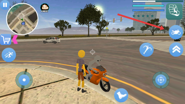 3、来到街道后,靠近橙色摩托车,点击对应交互按钮,驾驶摩托在城市中执行英雄任务。