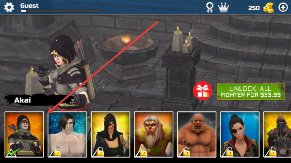 2、在角色选择界面,按照红色箭头指示,点击选择已解锁的Akai角色,该角色可用于参与战斗。