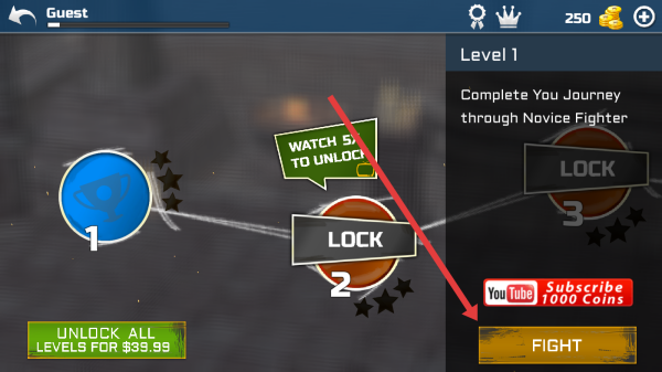 3、进入关卡选择,通过选择Level-1点击对应的FIGHT按钮,随即正式开始第一场格斗游玩之旅。