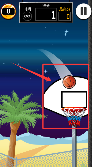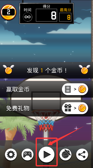 1、进入游戏主界面,点击指引手势标志,启动投篮挑战模式。