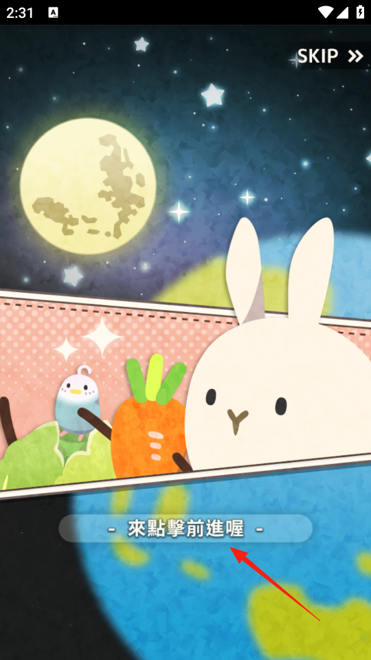1、点击来点击前进哦,推进剧情,跟随兔子开启冒险,探索月夜场景,了解故事背景,体验叙事推进机制。