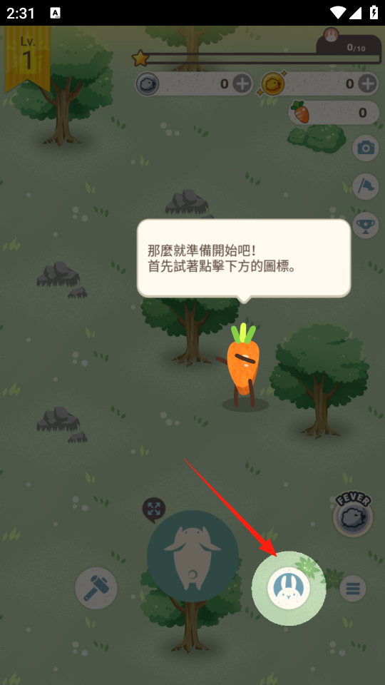 2、按照指引,点击下方图标,触发互动,与胡萝卜角色交流,开启任务熟悉操作流程,体验指引交互玩法。