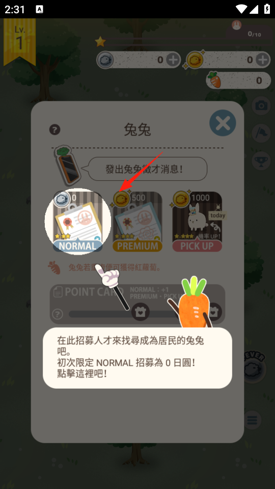 3、进入招募界面,选择NORMAL花费资源,招募兔兔居民,扩充角色,推进游戏建设,体验招募养成机制。
