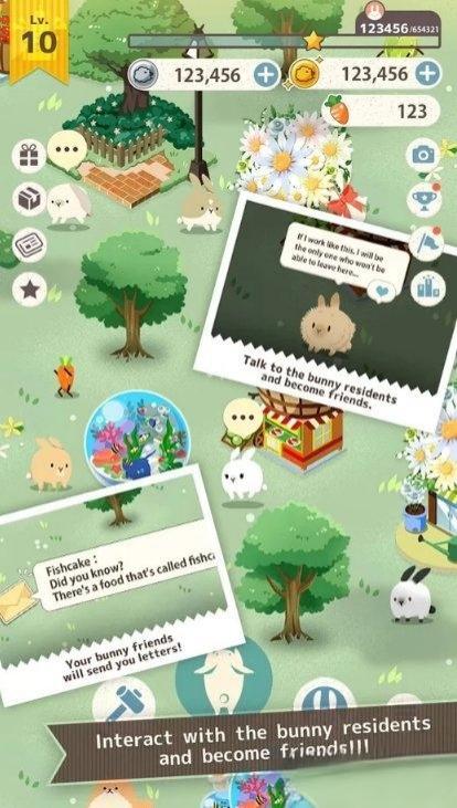3、地图场景广阔:拥有较为广阔的地图,除了家园区域,还有其他可供探索的场景,玩家可以带领兔子在不同地图中做游戏、互动,也让内容更丰富多彩。