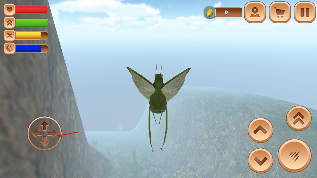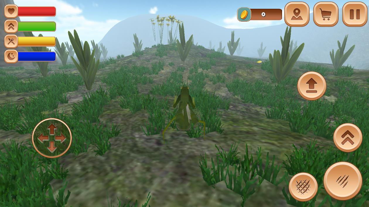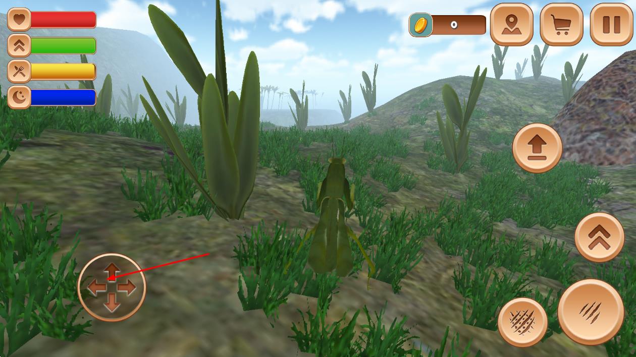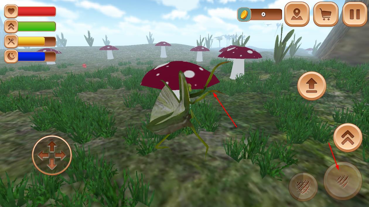 1、进入游戏后,在初始栖息地熟悉螳螂的移动与攻击方式,通过虚拟摇杆控制方向,点击按钮发动攻击,捕捉小型昆虫作为食物。