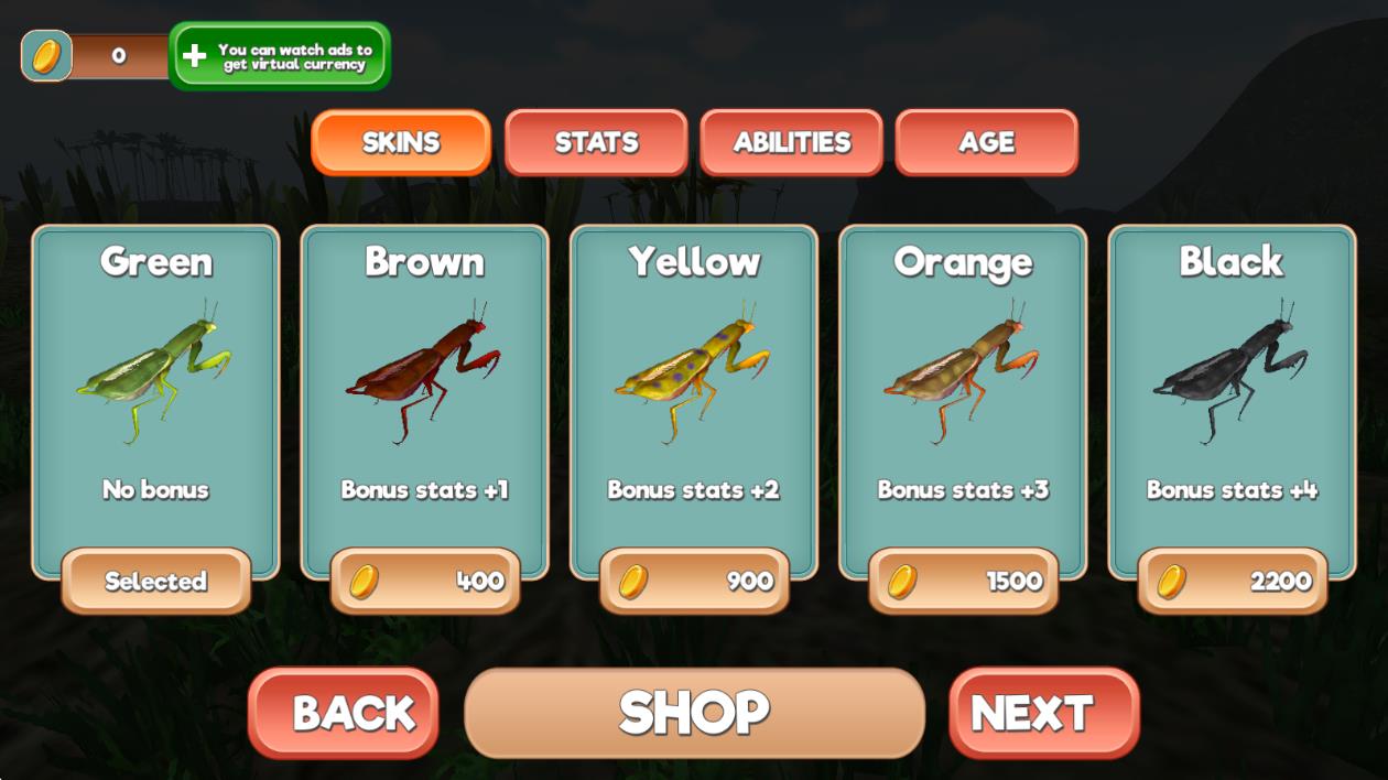 3、技能进化系统:随着生存时间延长,可解锁如更快的反应速度、更强的攻击力等技能,帮助螳螂更好地适应环境,提升生存能力。