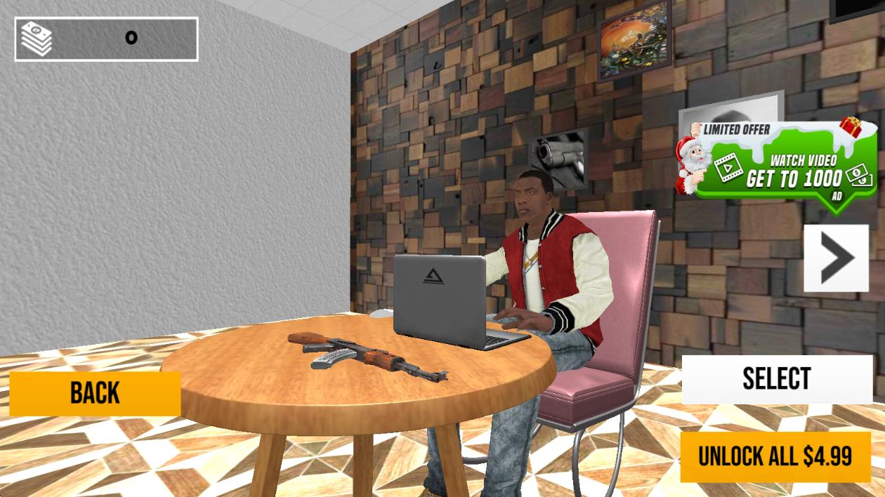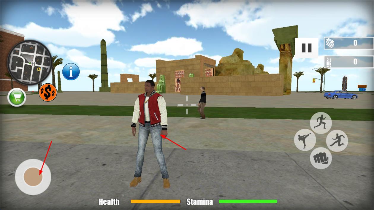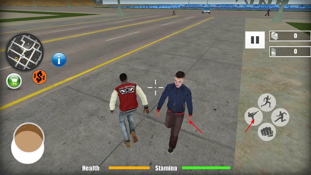 1、进入游戏后,在初始街区熟悉操作,通过虚拟摇杆移动角色,点击武器图标切换装备,尝试首次抢劫商店获取启动资金。
