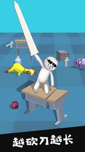1、魔性解压的砍杀体验,开局仅有一把短刀,通过不断破坏场景中的物品,武器长度会持续增长,最终可达成夸张的四十米大刀,带来强烈的成长爽感。