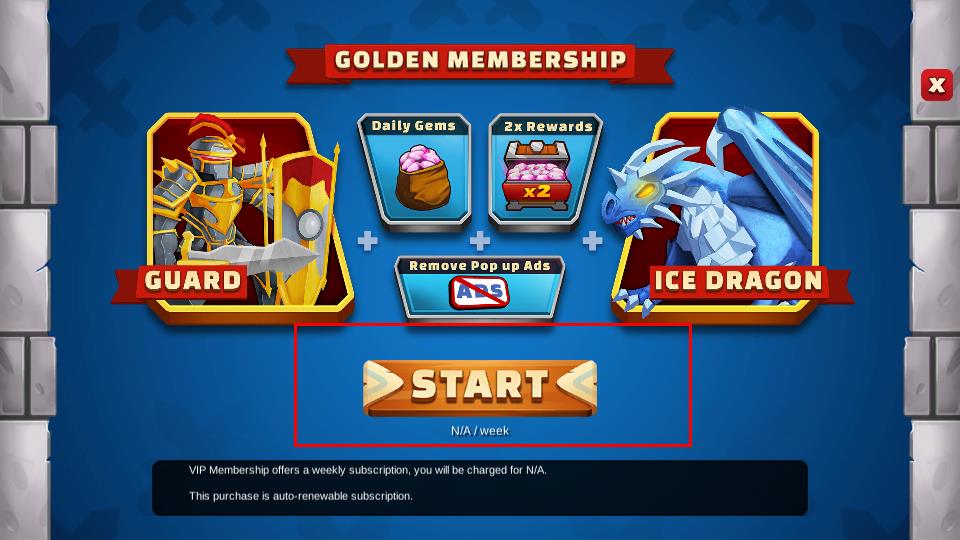 1、在会员订阅界面,点击START按钮,可选择开启会员获Guard、Ice Dragon等福利或直接进入游戏,开启策略对战体验。