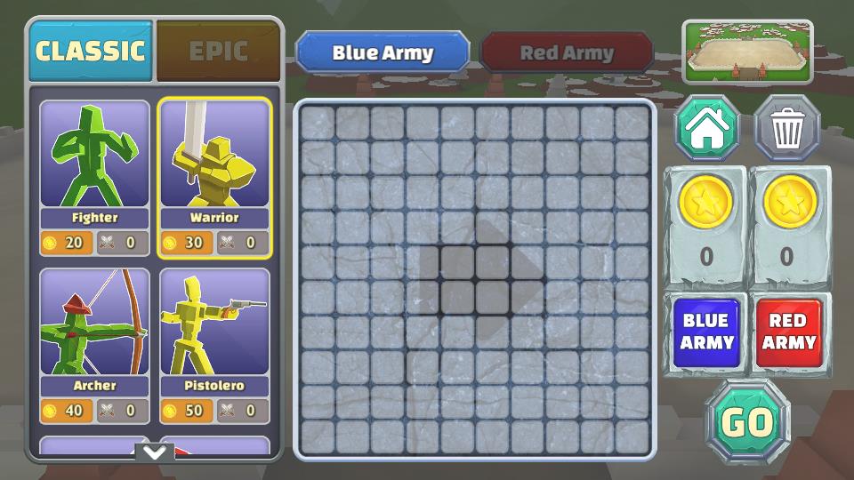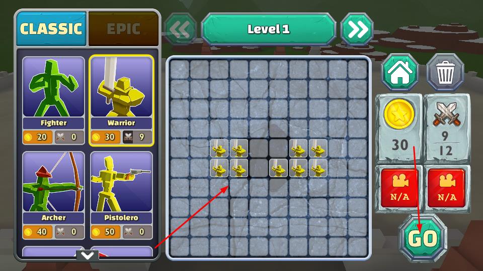 2、进入游戏布局界面,在Level1关卡,从左侧选择兵种如Fighter、Warrior等,花费金币放置到棋盘对应位置,点击GO按钮启动战斗。