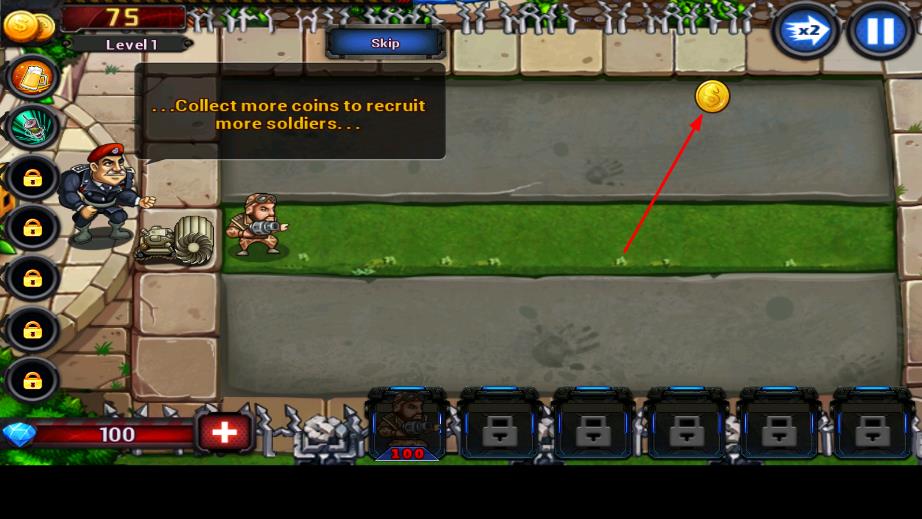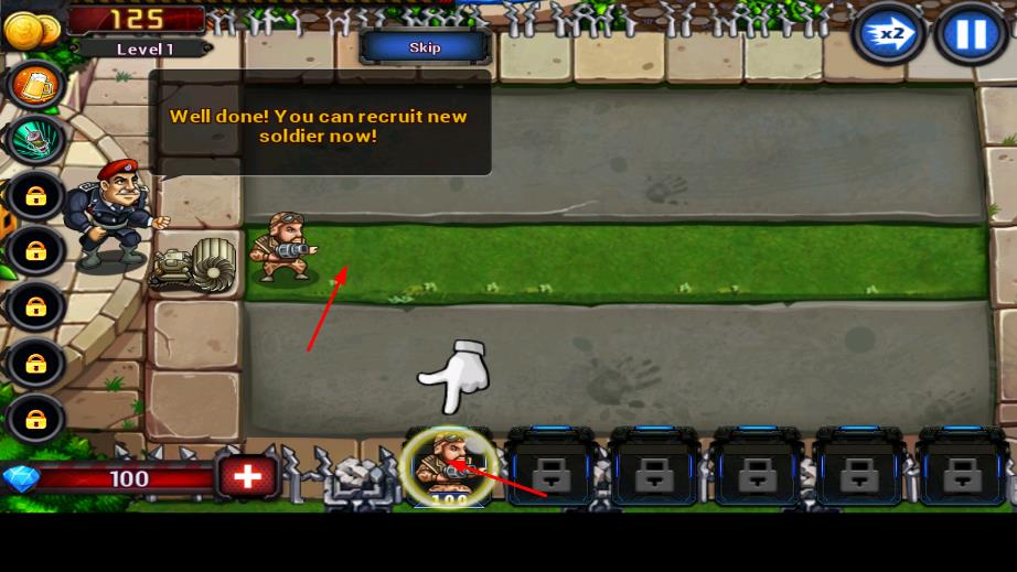 1、进入后,在关卡选择界面,点击关卡1,,界面会显示可用的士兵种类及对应的部署成本。