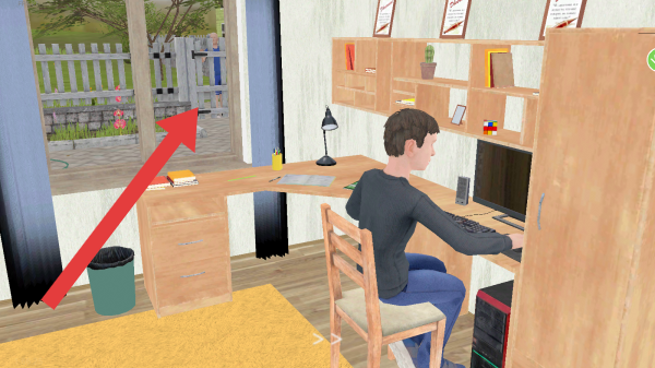 2、显示角色在室内是书房,红色箭头指向门外,是逃离路径相关,玩家需操控角色从这里尝试逃出。